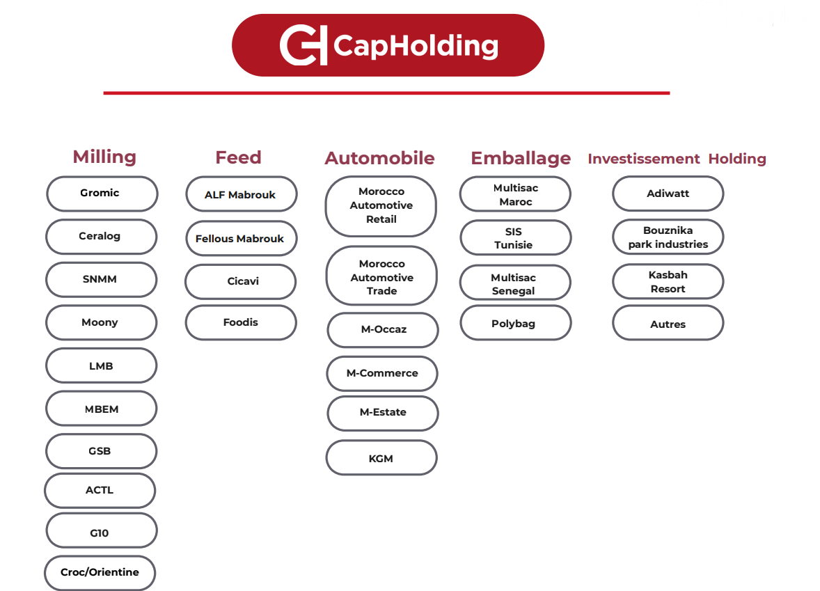 Cap Holding dispose de 5 pôles (Minoterie, Feed, Automobile, Emballage & Investissement) englobant 27 filiales en parfaite synergie. Nos investissements multiples et la diversité de nos métiers traduisent notre volonté de développer notre groupe et créer un écosystème propre au groupe